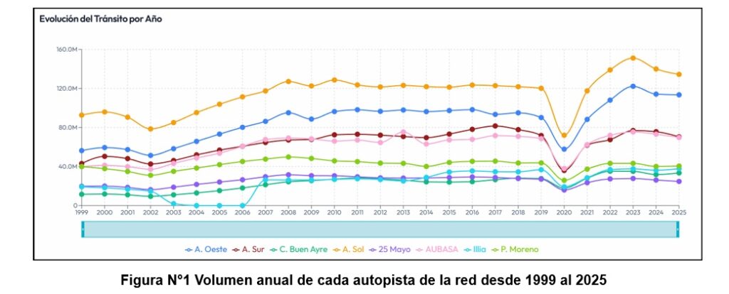 Al año siguiente 2020 la caída de la circulación vehicular es muy importante debido a las limitaciones que se impuso al desplazamiento de las personas por la epidemia del COVID. Pasado un prolongado periodo de inmovilidad se observa un progresivo aumento de los volúmenes desde 2021 hasta 2023 alcanzándose un máximo histórico en ese año. Los años 2024 y el pasado reciente 2025 presentan valores en descenso tendiendo a una situación de estabilidad similar al año 2018.