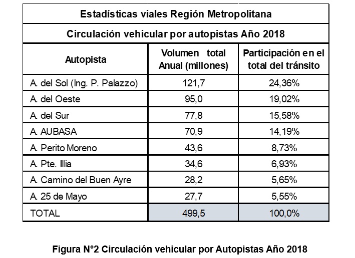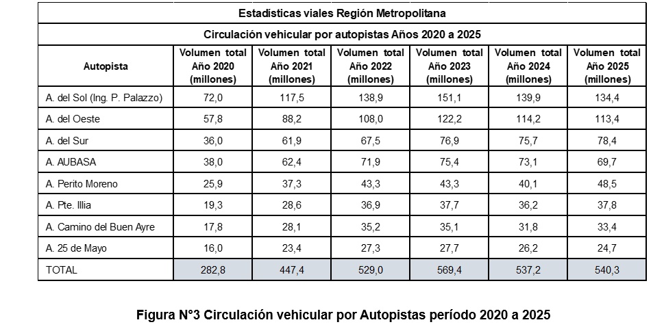 En el cuadro de la Figura N°2 se tienen la distribución por autopista de lo computado precisamente en el año 2018 y los. valores totales registrados en el período 2020 a 2025 que son los que se indican en el Cuadro de la Figura N°3.