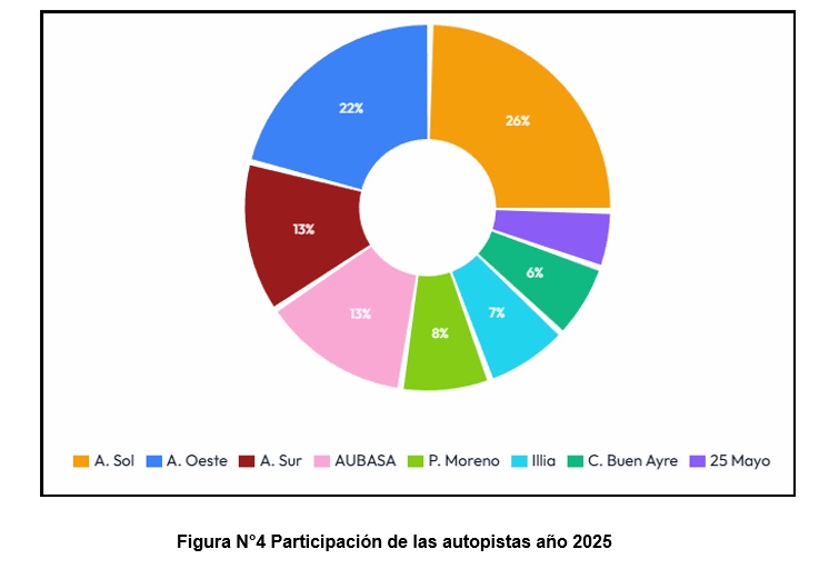 A fin de visualizar la participación de cada autopista en el global en la circulación vehicular de la región y en la prestación del servicio de las respectivas concesiones se acompaña la Figura N°4 con un gráfico comparativo de los totales registrados en la Año 2025.